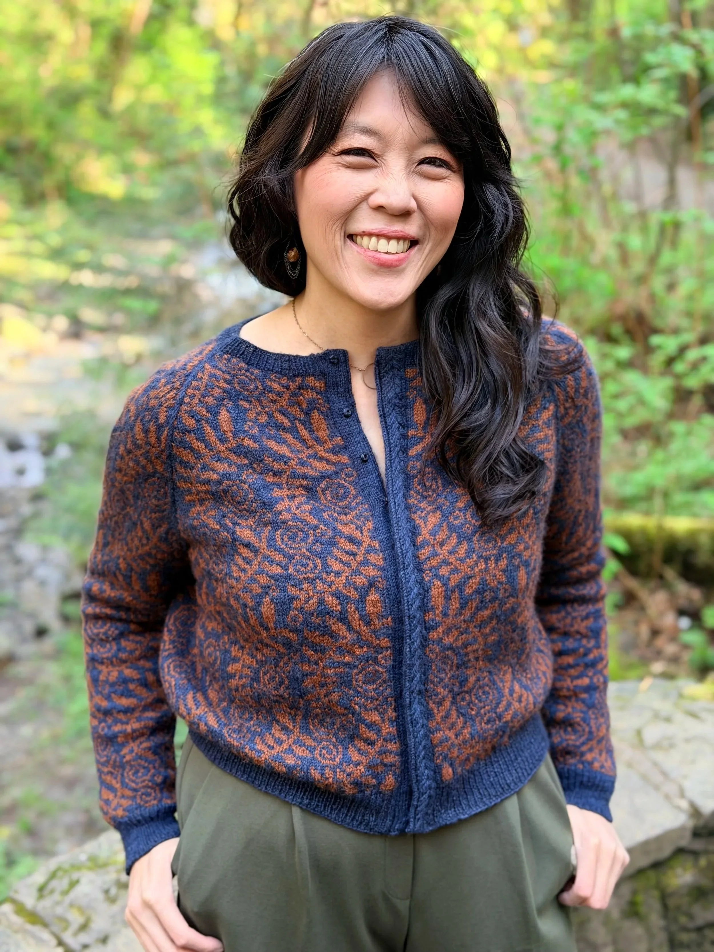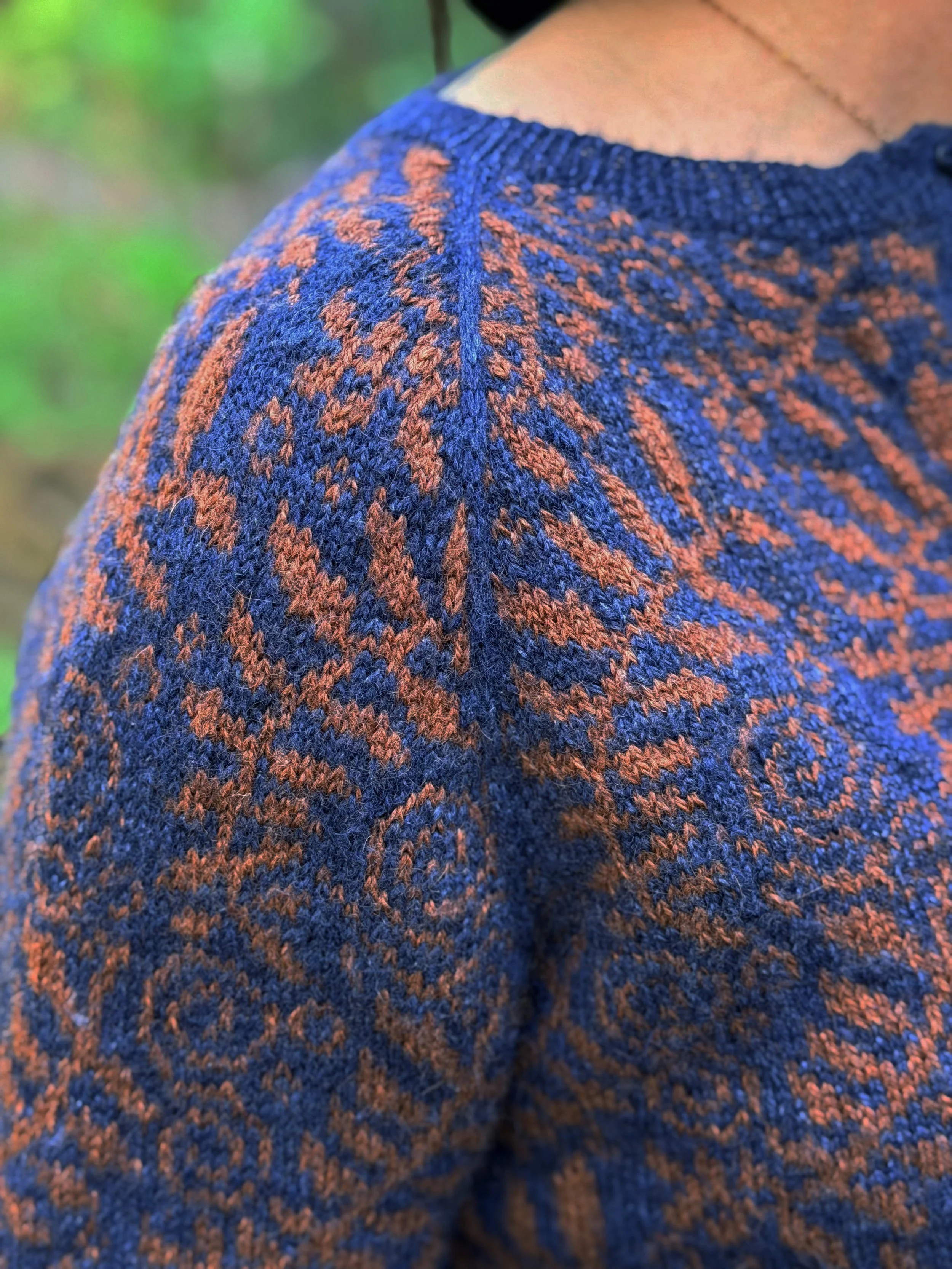 CHANGELING is a light fingering weight, all-over colorwork sweater with compound raglan construction and a dip stitch column in the center front. Worked in the round with cardigan (involves steeking!) and pullover variations.